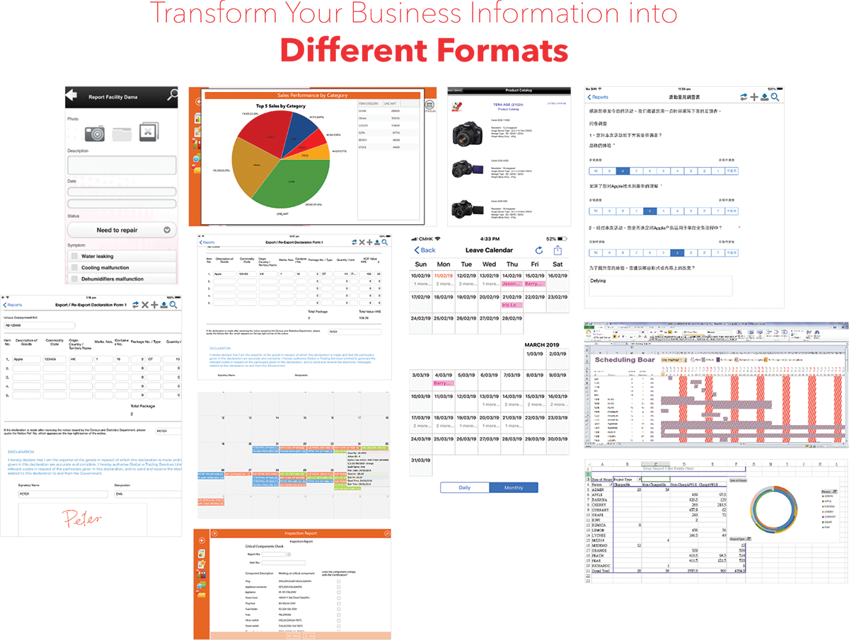 The data entry form needs to be updated from time to time in order to keep up with the business development. However, it may not be practical to hire a software specialist to modify the entry form when necessary. Now, everyone in the organization can simply create new input interface called r-From with great convenience. r-FORM can be linked up with any database system and provides flexible solutions for users to quickly build forms and deploy to the mobile devices without any extra cost.